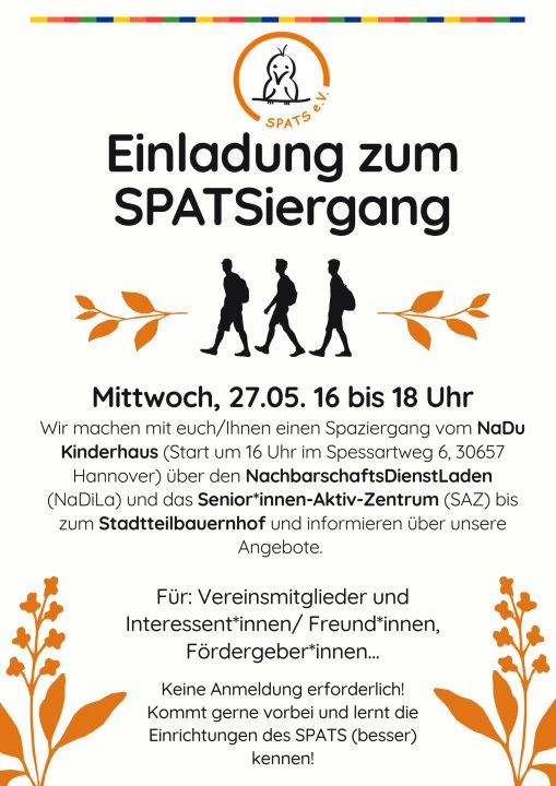 Der SPATS e.V. ist Träger der Einrichtungen NachbarschaftsDienstLaden (NaDiLa), NaDu-Kinderhaus und Stadtteilbauernhof des und Senior*innen-Aktiv-Zentrum.